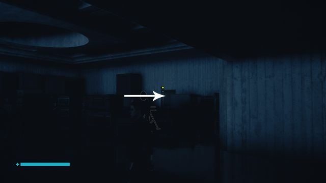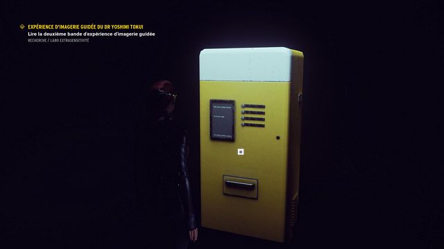 Dirigez-vous vers le distributeur jaune (photo ci-dessous à gauche). Appuyez dessus, la machine disparaît. Suivez-la dans le noir. Suivez ensuite les projecteurs au sol, vous arriverez à un cadavre (photo ci-dessous à droite). Touchez le