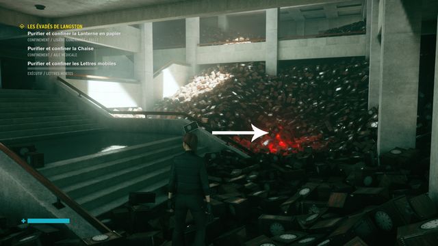 Cette mission se prend en récupérant des documents. Rejoignez "le centre de recherche", passez la porte "Parapsychology" et la porte "Astral Exibition". Allez au 2ème étage de la pièce (photo ci-dessous à gauche) et cliquez sur les documents