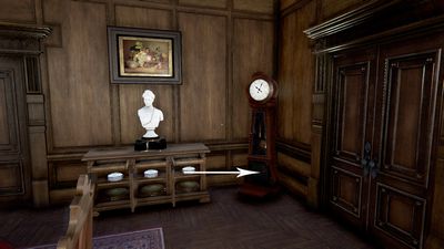 Le cadre en face de vous s'ouvre et laisse apparaître un coffre-fort (photo ci-dessous à gauche) ainsi que l'heure de 7:45. Allez mettre la montre à gousset à l'heure de 7h45. La montre à gousset s'ouvre, faites