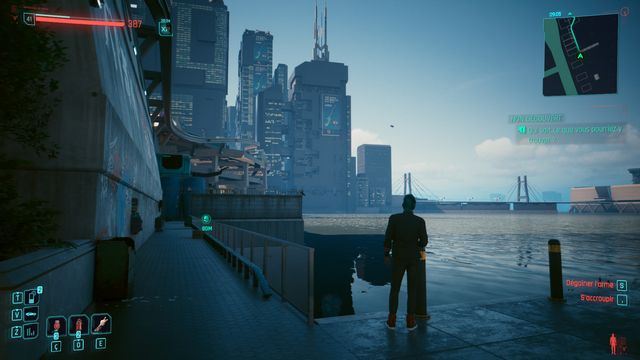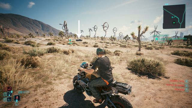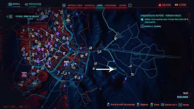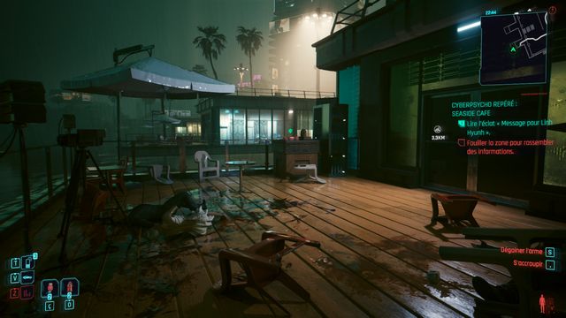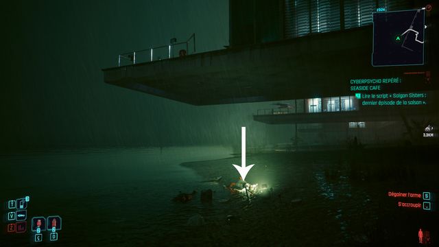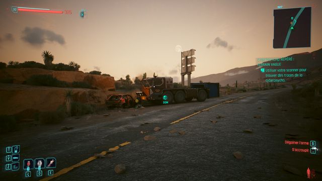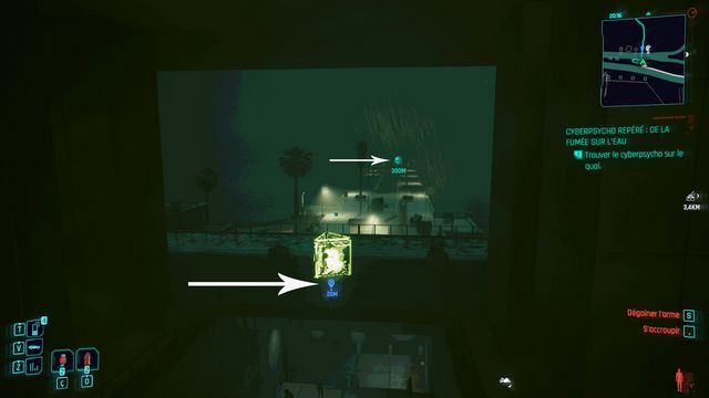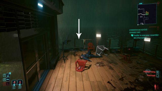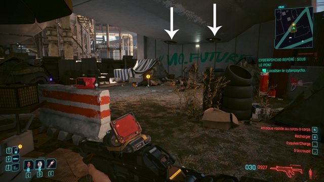 Examinez le cadavre à côté de la voiture. Passez en mode scanner et suivez les traces (photo ci-dessous à gauche). Le cyberpsycho est planqué sur la plateforme de l'éolienne (photo ci-dessous à droite).