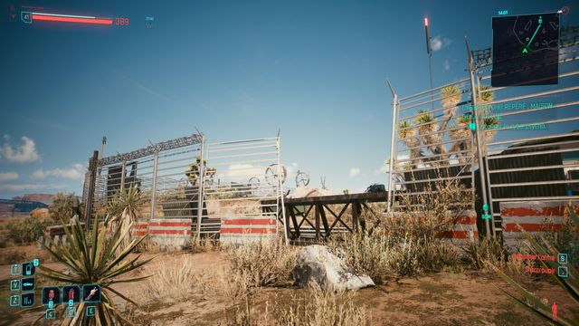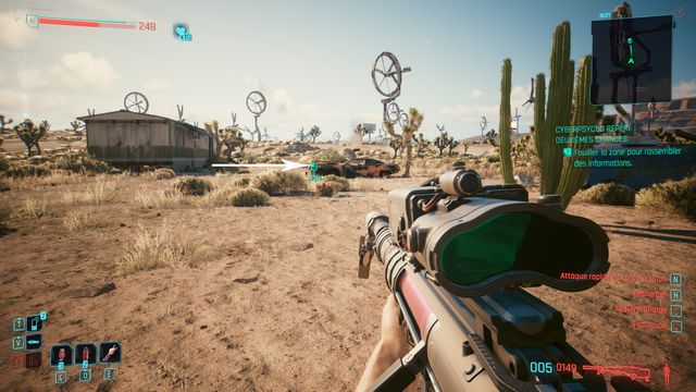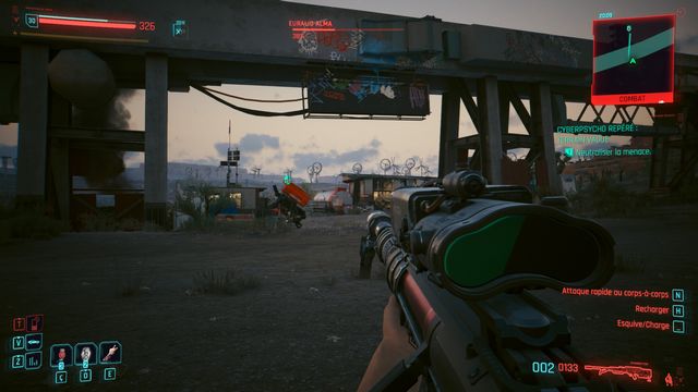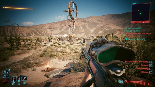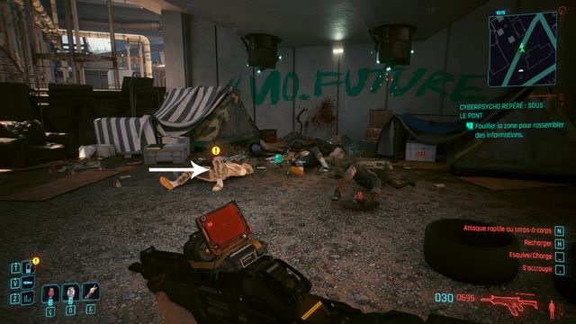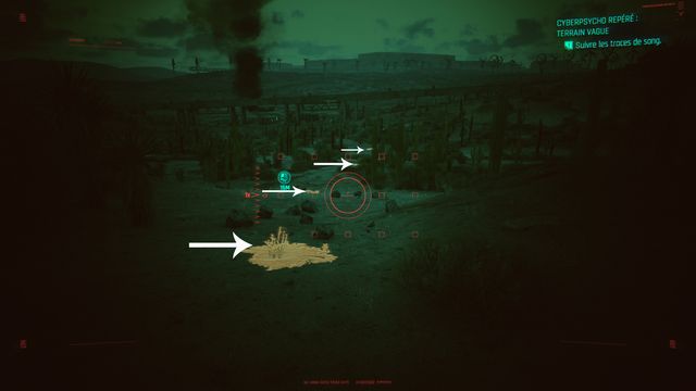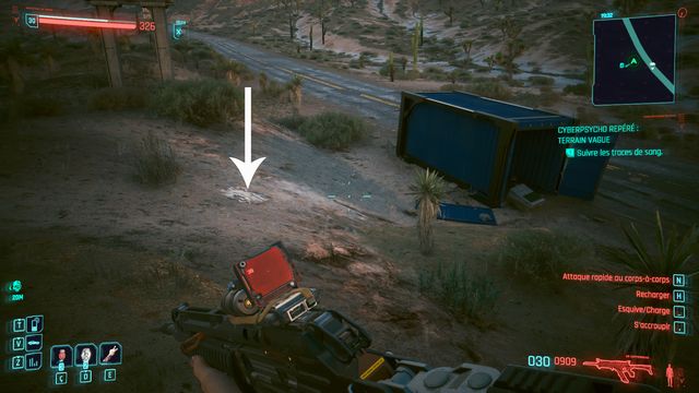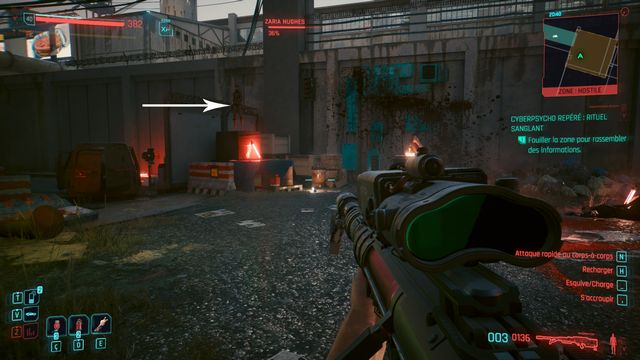 Vous arrivez au campement du cyberpsycho (photo ci-dessous). Vous pouvez rester à distance et lui tirez dessus avec un fusil de sniper. Il ne bouge pas de sa zone. Une fois Eurolio Alma tué, appelez Regina pour faire votre rapport.