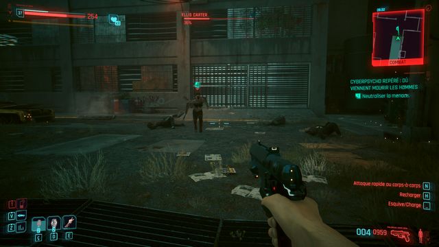 Utilisez le scanner et suivez les traces au sol (photo ci-dessous à gauche). Vous faites face à Ellis Carter (photo ci-dessous à droite). Rien de compliqué pour ce cyberpsycho, n'importe quelle arme fait l'affaire.