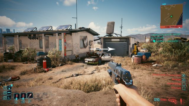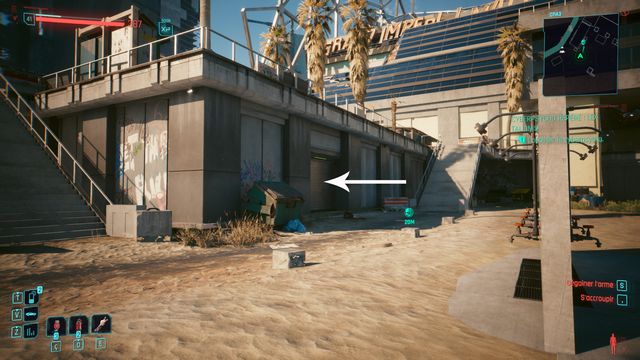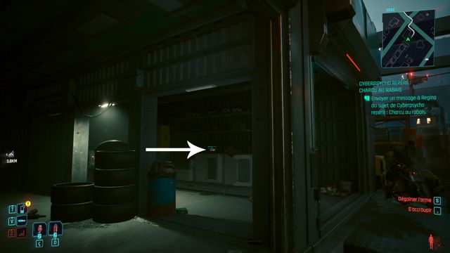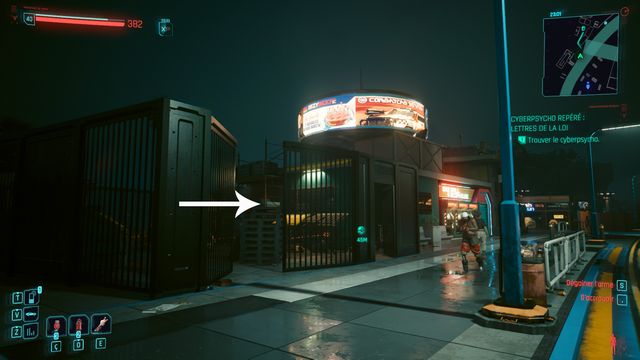 Faites le tour, vous trouverez une entrée (photo ci-dessous à gauche). Cliquez sur le rideau de fer du garage (photo ci-dessous à droite). Le cyberpsycho est à l'intérieur.