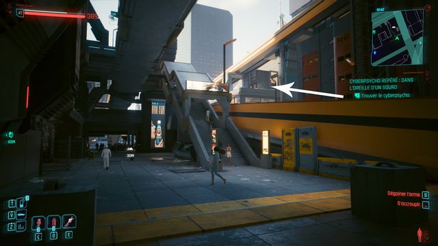 Vous rencontrez "Norio Akuhara". Il est invisible, vous pouvez le suivre grâce à l'icône du cyberpsycho au-dessus de sa tête. Rien de particulier, essayez de vous mettre en hauteur (sur une caisse) et tirez-lui dessus avec un fusil à pompe ou