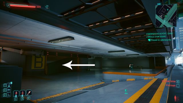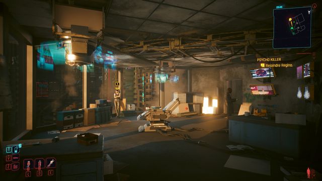 Cliquez sur le rideau de fer pour l'ouvrir (photo ci-dessous à gauche). Tuez les ennemis et les caméras à l'intérieur avant de vous occuper du cyberpsycho. Vous faites face à Ben Debaillon. Rien de particulier sur ce cyberpsycho. N'importe
