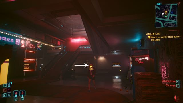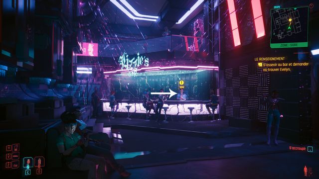Vous êtes intercepté par une Mox devant l'entrée. Dites-lui que vous êtes déjà venu pour entrer. Allez vous asseoir au bar et demandez où vous pouvez trouver Evelyn (photo ci-dessous à gauche). Suivez Evelyn quand elle quitte le bar puis asseyez-vous