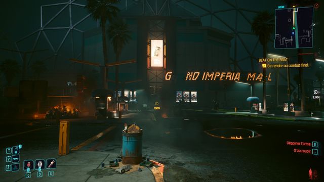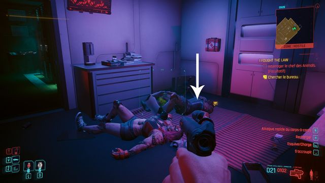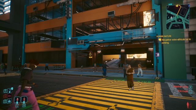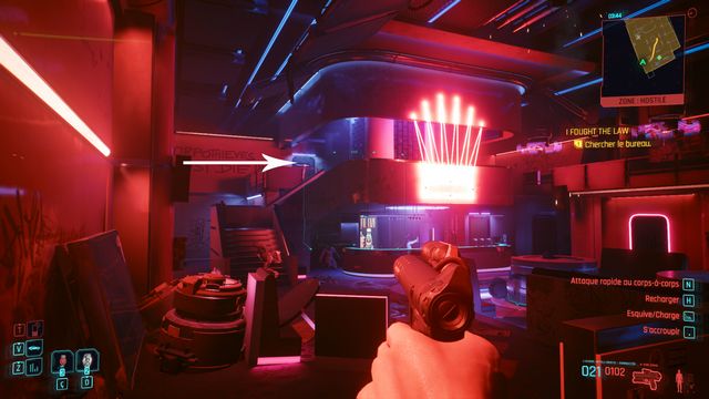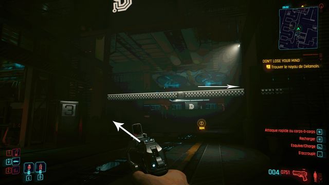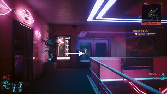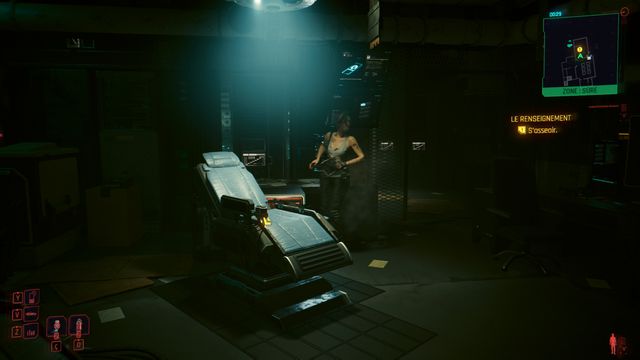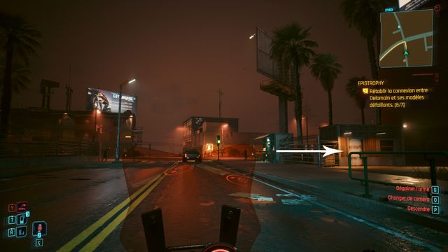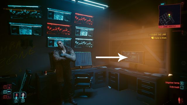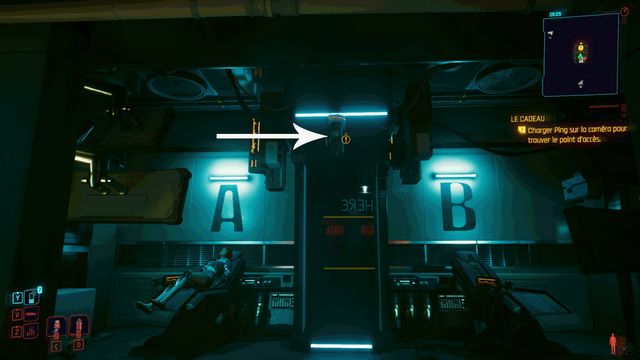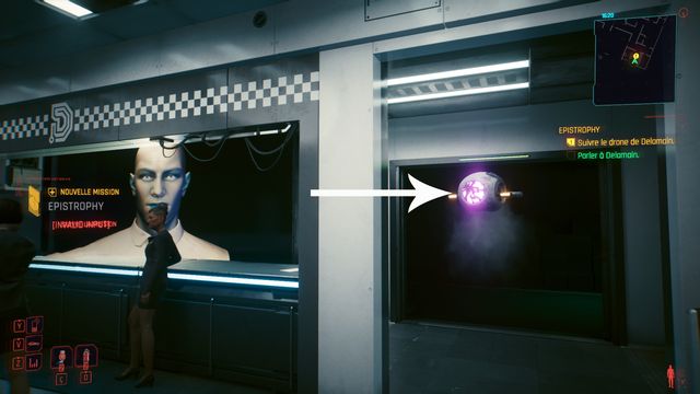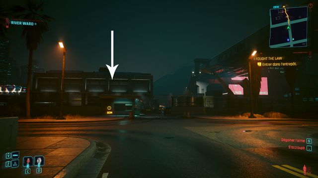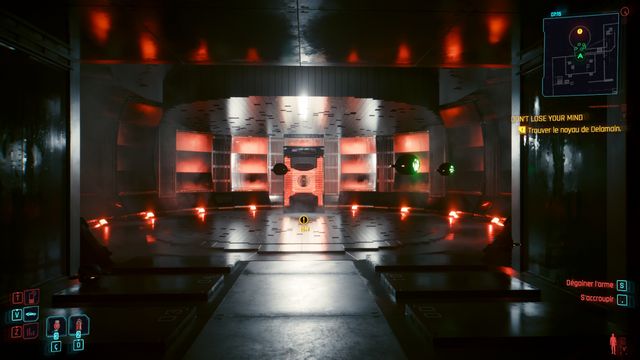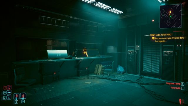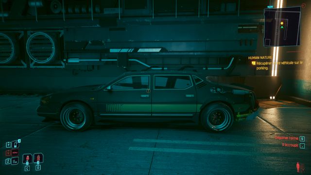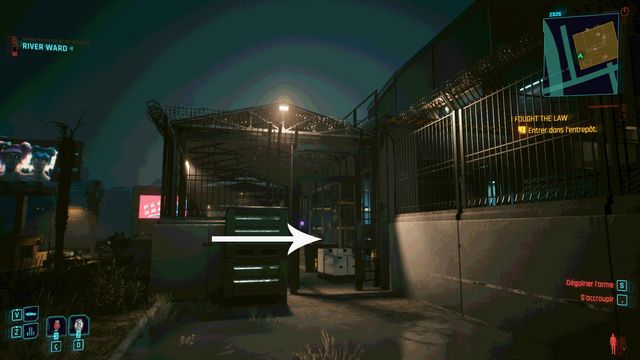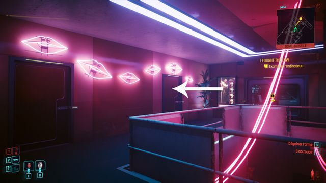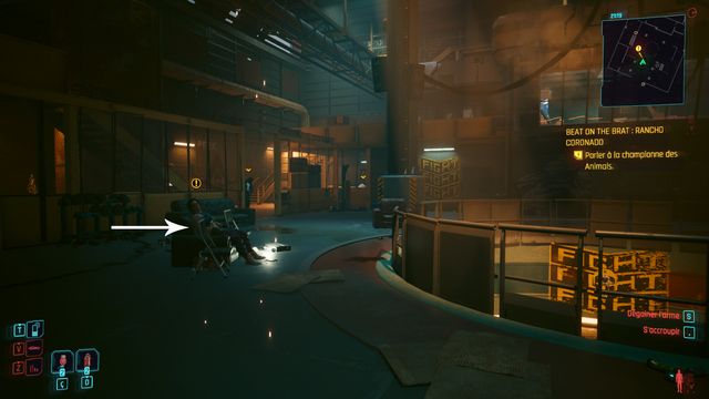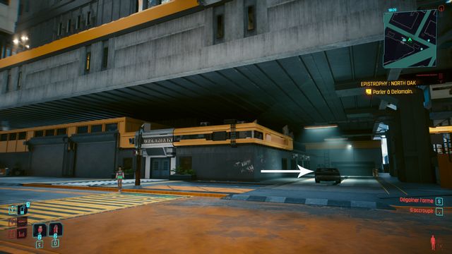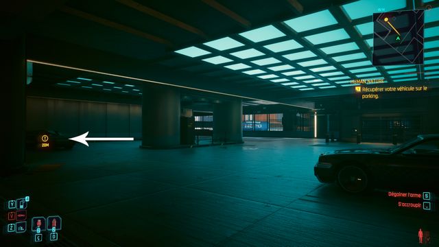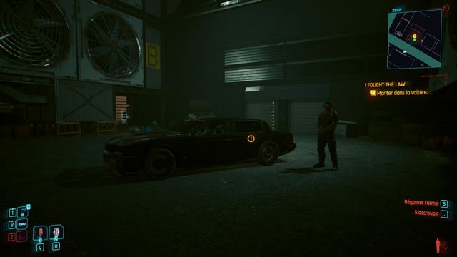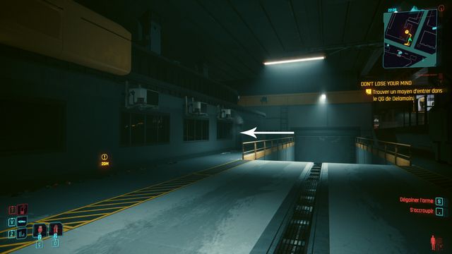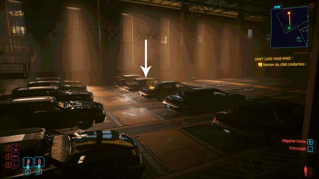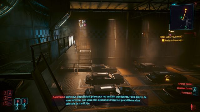 Cliquez sur le bouton sur la console derrière Johnny et choisissez de "préserver l'intégrité de Delamain". Faites comme si vous ressortiez et prenez le petit passage à gauche de la porte, il vous mène au hangar (photo ci-dessous à gauche).
