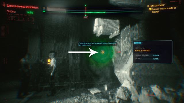 Passez ensuite sur la couche "Audio" et faites de même. Vous avez 2 moments où il faut écouter à proximité des personnes qui parlent (photo ci-dessous à gauche). Le personnage important est celui en vert (photo ci-dessous à droite).