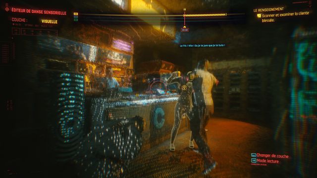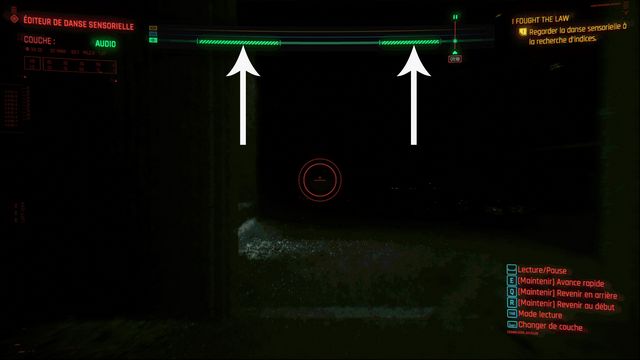 Allez à l'entrée du magasin, vous trouverez une nouvelle source sonore (photo ci-dessous à gauche). Changez de couche quand on vous le demande, avancez l'enregistrement jusqu'au moment où le malfrat tape la femme (photo ci-dessous à droite)