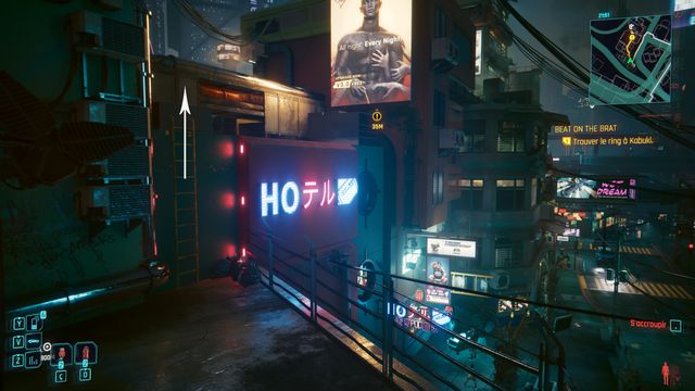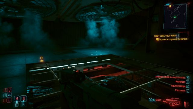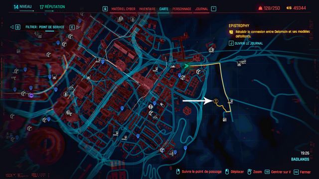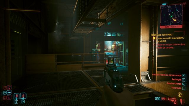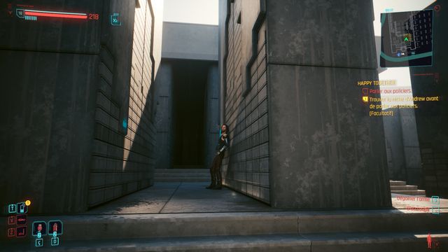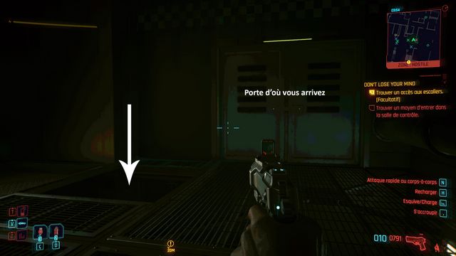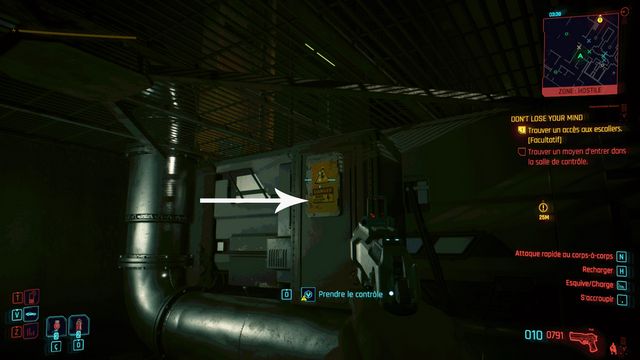 Entrez dans le QG de Delamain pour mettre l'objectif à jour. Ressortez et contournez le bâtiment par la droite. Piratez l'accès à la porte de service (photo ci-dessous à gauche). Entrez dans le bâtiment, connectez-vous à un des ordinateurs et