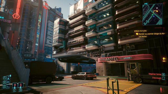 Vous pouvez prendre le téléporteur pour "Kabuki : Centre" pour rejoindre l'endroit suivant (photo ci-dessous à gauche). Entrez dans le motel "No Vacancy" (photo ci-dessous à droite).