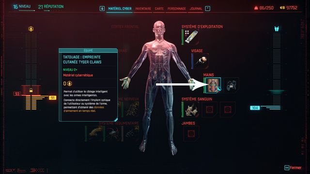 Passez la porte au fond "DOC Ryder" (photo ci-dessous à gauche). Parlez au mec derrière le comptoir et allez dans les options de "main". Prenez le tatouage "Empreinte cutanée Tyger Claws" (photo ci-dessous à droite).
