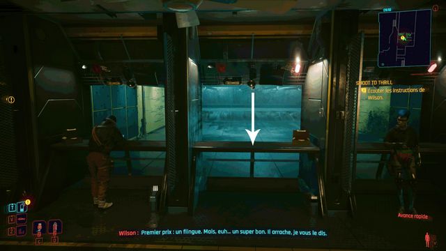 Rejoignez le stand de tirs de Willson. Il est à proximité de votre appartement, en face de l'ascenseur qui permet de descendre pour rejoindre l'extérieur (photo ci-dessous à gauche). Suivez Choom et installez-vous au stand de tir (photo