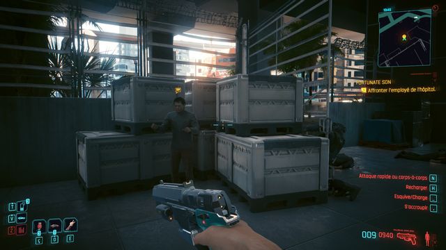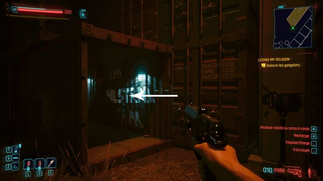 Passez entre les caisses et traversez le container ouvert (photo ci-dessous à gauche). Sécurisez la zone puis allez parler au moine (photo ci-dessous à droite).