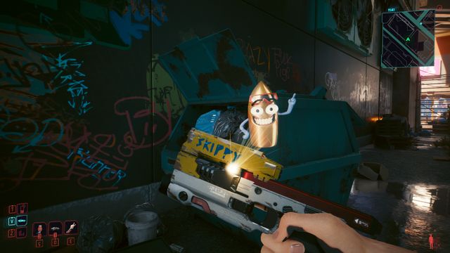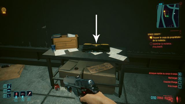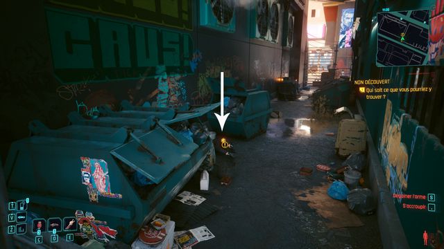 Sautez par-dessus la pile de journaux, vous voyez un cadavre entre les bennes (photo ci-dessous à gauche). Cliquez sur l'arme au sol, dans la mallette. Vous récupérez un pistolet "Skippy".
