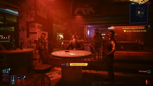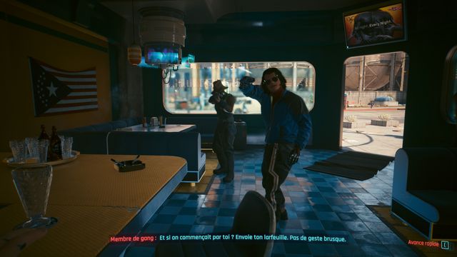 Entrez dans le bar et prenez une boisson. Des mecs arrivent pour faire un hold-up (photo ci-dessous). Ne leur payez pas la somme qu'ils demandent et menacez-les. Les bandits partent. Vous achetez gratuitement des consommables auprès