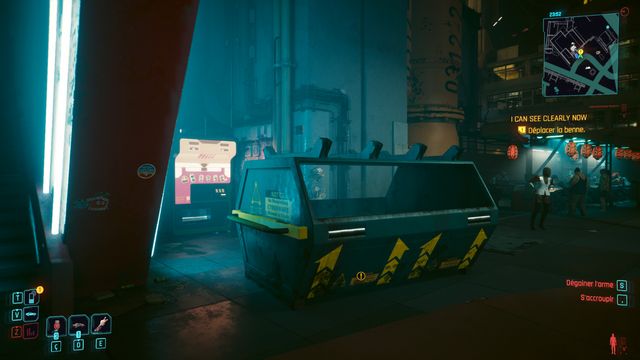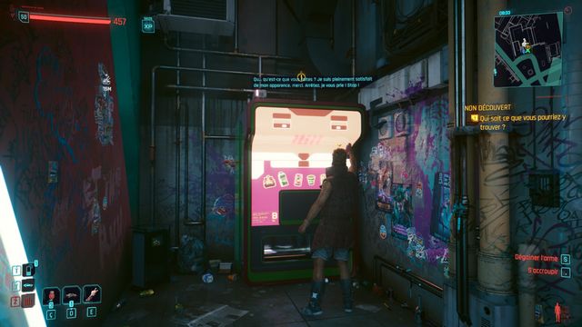 Parlez à Brendan, le distributeur de boisson (photo ci-dessous à gauche). L'IA du distributeur vous offre une canette de "Nicola" gratuite. L'IA vous demande de bouger la benne devant elle (photo ci-dessous à droite).