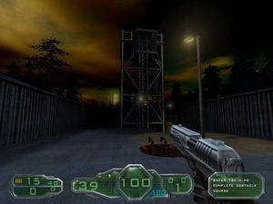 Tuez tous le monde, récupérez les medikit si besoin et les munitions puis allez en face. Suivez les passerelles si vous tombez au sol, vous explosez ! Vous arrivez à une place (photo ci-dessus à droite). Faites le ménage puis descendez l'escalier tout au fond à gauche. Vous arrivez dans un couloir, tirez sur l'extincteur sur le mur (photo ci-dessous à gauche).
