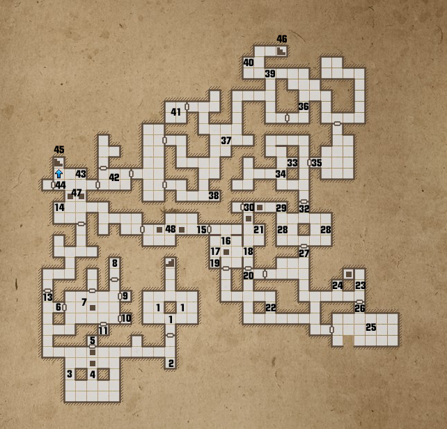 L'escalier 45 mène au point 3 de la carte du niveau 4 et l'escalier en 46 mène au point 1 du niveau 4. Si vous tombez dans les trappes en 47, vous rejoignez le point 48 du niveau 4. Les trappes en 48, la trappe