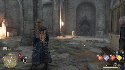 Parlez au professeur Fig devant le château (photo ci-dessous à gauche). Faites le tour du château par la gauche (photo ci-dessous à droite).