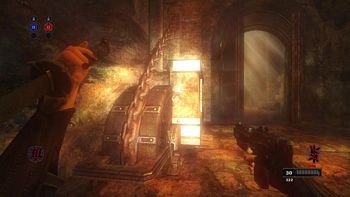 pour détruire l'éboulement. Avancez, montez l'escalier, vous arrivez à l'endroit suivant (photo ci-dessous à droite).