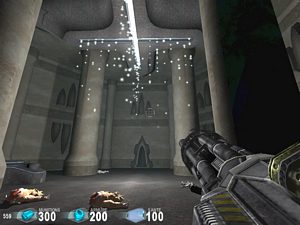 Allez au fond à gauche rejoindre les 3 armoires (photo ci-dessus à droite). Puis tirez sur les fusibles bleus afin de désactiver le champ de force. Revenez à l'intersection des 4 tunnels (vous devez avoir le tunnel avec la porte fermée en face de vous). Tournez à gauche. Vous arrivez dans la salle suivante (photo ci-dessous à gauche).
