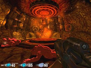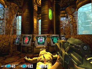 Prenez le passage sur la gauche, allez tout droit, vous arrivez à des ordinateurs (photo ci-dessus à droite). Actionnez l'ordinateur pour inverser les flux. Revenez à la salle de la sphère puis passez la porte sur votre gauche. Allez tout droit, vous traversez une salle rouge, prenez la 1ère porte sur la gauche. Vous arrivez à l'endroit suivant (photo ci-dessous à gauche).