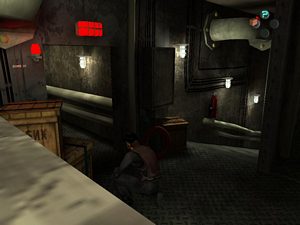Allez chercher la clé plate au sol à gauche. Revenez jusqu'à la porte et descendez l'escalier qui se trouve à droite. Vous trouverrez une corde (photo ci-dessus à droite). Remontez l'escalier puis passez par la porte à droite. Vous arrivez dans un couloir du cargo (photo ci-dessous à gauche).