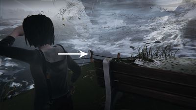 Traversez en longeant les rochers à droite. Il faut traverser après que le tronc d'arbre explose sous la foudre et avant que ne tombe le haut du phare car ce dernier va creuser le terrain et vous empêcher de