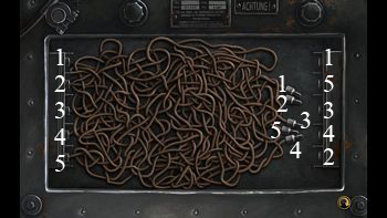 sur la plaque de neige sur le toit. Vous bloquez le chien dans sa niche. Cliquez sur le coffre étrange, le but est de suivre le fil à