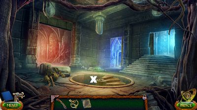 Rejoignez "Le Couloir" puis utilisez "le bas-relief" sur le socle au sol (photo ci-dessous à gauche). Vous récupérez "la branche". Revenez à "L'Enceinte du Temple" puis utilisez la branche