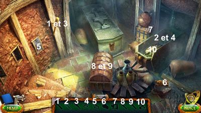 Entrez dans la salle "les Vieux Bains" et cliquez sur la porte à gauche (photo ci-dessous à gauche), vous démarrez un jeu d'objets cachés (photo ci-dessous à droite).