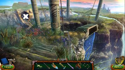 récupérez "le flacon" et la "la clé étrange". Retournez sur l'Île jusqu'au réservoir d'énergie et cliquez sur le pilier suivant (photo ci-dessous à droite).