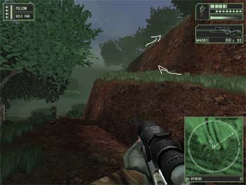 Tuez tous le monde, allez jusqu'au camp, récupérez les munitions et les medi-kits au sol puis continuez votre chemin en vous aidant du radar. Montez le sentier accèdant à la montagne (photo ci-dessous)