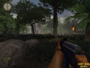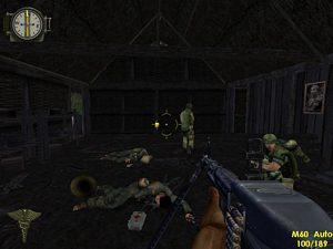 Vous démarrez en hélicoptère. Lorsque le tireur se fait descendre, prenez sa place à la mitrailleuse. Tirez sur tout ce qui bouge jusqu'à ce que l'hélicoptère s'écrase....Vous êtes à l'endroit suivant (photo ci-dessous à gauche).