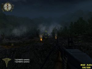 Lorsqu'on vous dit de sortir du trou, précipitez-vous vers votre droite, vous arrivez dans les marais (photo ci-dessus à droite). Suivez votre boussole pour vous orienter et nettoyez le chemin. Vous revenez sur le même champ de bataille. Retournez dans votre trou et tenez de nouveau la position. Prenez ensuite la jeep (photo ci-dessous à gauche).