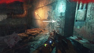 Laissez le monstre tué l'autre puis montez l'escalier et activez la valve (photo ci-dessous à gauche). Vous ouvrez la porte à côté de vous. Entrez dans la pièce à droite (photo ci-dessous à droite).