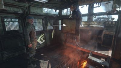 Attendez que Sam finisse de saboter le poste de commandement puis suivez Melnik. Lisez la note à gauche (photo ci-dessous à gauche) puis montez dans l'ascenseur avec les autres. Vous rejoignez la draisine, tirez