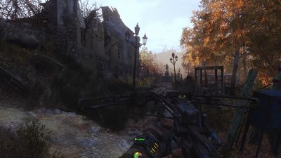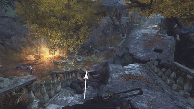 La draisine tombe à l'eau et vous vous réveillez à l'endroit suivant (photo ci-dessous à gauche). Récupérez l'arbalète accrochée au dos de la statue (photo ci-dessous à droite).