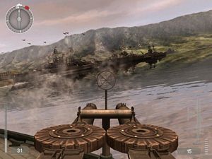 Faites le tour du gros canon à gauche pour monter les escaliers en fer (photo ci-dessus à droite). Vous voyez une mitrailleuse sur le pont (photo ci-dessous à gauche). Utilisez-là pour détruire les avions qui arrivent. Lorsqu'elle explose allez à droite et prenez le commandement d'un des canons (photo ci-dessous à droite).