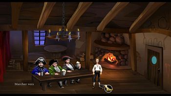 tout de suite au bar (photo ci-dessous à gauche). Parlez au pirate à la veste rouge juste à côté de la porte. Demandez-lui où se trouve
