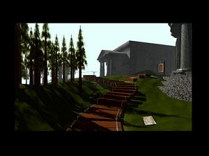 Allez tout droit jusqu'aux "Rouages" puis montez les marches. Dirigez-vous vers le Nord, vous voyez une feuille à droite des marches (photo ci-dessus à droite). Ramassez-là. Vous ramassez la lettre d'Atrus destinée à Catherine. La lettre vous indique qu'il faut connaitre le nombre de levier situés sur l'île. Les leviers se présentent sous la forme suivante (photo ci-dessous à gauche). A chaque fois que vous voyez un levier, actionnez-le.