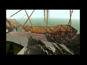 La batterie se décharge, retournez au phare pour recharger la batterie puis redescendez et allez sur le bâteau (photo ci-dessus à droite). Une entrée s'est ouverte. Descendez pour arrivez dans une grande pièce. Descendez, vous arrivez à une table vide. Cliquez dessus un livre apparait ! C'est le livre de téléportation. Vous revenez sur l'île de Myst. Placez la page bleue dans le livre bleu puis la page rouge dans le livre rouge. Il faudra faire 2 aller-retour car vous ne pouvez porter qu'une seule page à la fois.