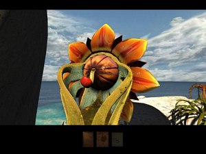 Entrez à l'intérieur, ramassez les feuilles du journal de Saavedro puis lisez-les. Allez toujours tout droit, vous rejoignez l'autre fleur bleue. Saississez la liane située entre les branches en bois. C'est parti pour le décollage. L'oiseau vous emmène....Cliquez sur un des côtés de la cage, vous descendez sur un toboggan et découvrez le 2ème symbôle (photo ci-dessus à droite). Vous voyez en face le livre pour revenir à J'nanin. Vous vous retrouvez dans la salle des symbôles.