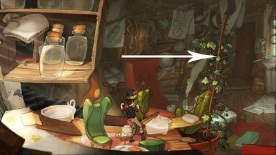 à la chaleur". Allez à droite de l'écran, vous voyez un géant dormir. Utilisez le grappin pointu sur la plante grimpante (photo ci-dessous à droite).