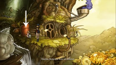 Entrez dans la maison des nains, le lacet se casse. Ressortez puis utilisez la longue brosse couverte de sirop sur la toile d'araignée (photo ci-dessous à gauche). Vous récupérez