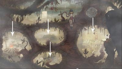 gland et la racine". Utilisez la roue en pierre pour revenir à la scène où il y a le feu de camp puis utilisez la tasse sur les souches au milieu (photo ci-dessous à gauche). Vous faites un cercle au