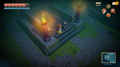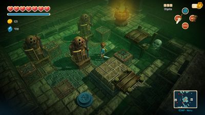 Montez sur le bout de pont et sautez sur la caisse. Cliquez sur le levier suivant (photo ci-dessous à gauche), il abaisse un pilier. Placez une bombe sur le mur suivant (photo ci-dessous à droite). Vous découvrez