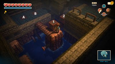Suivez le passage en hauteur, vous arrivez à un levier (photo ci-dessous à gauche). Vous abaissez le niveau de l'eau. Redescendez et allez poser une bombe à l'endroit suivant (photo ci-dessous à droite). Vous