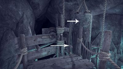 Récupérez les 2 poids autour du tube (photo ci-dessous à gauche) puis placez-les sur 1 des 3 piliers. Vous avez 3 cordes qui font bouger chaque échelle avec un levier (photo ci-dessous à droite). Le levier en "A" fait